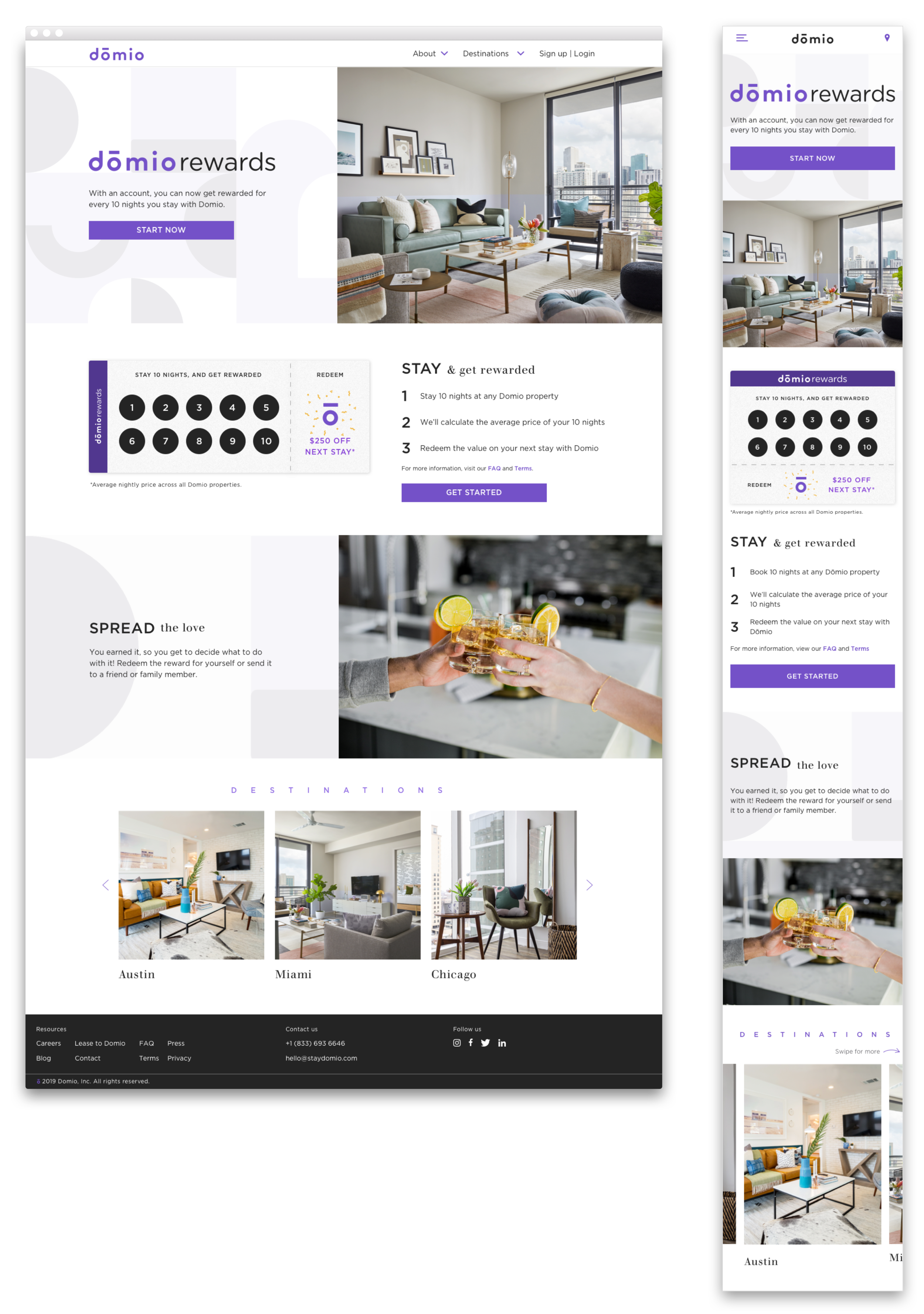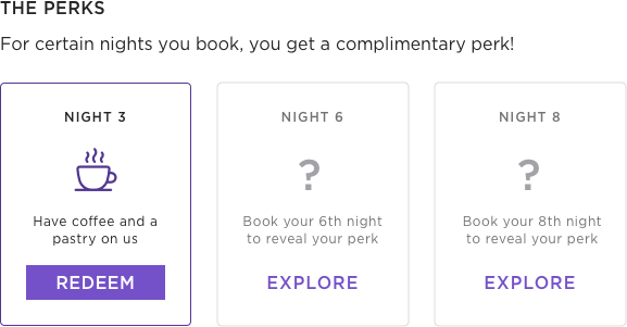 Unlike most punch card programs, Domio is not promoting a “Free night stay” after guests accumulate 10 nights. Instead we are saying “Get $250”. Preliminary user tests (via usertesting.com) have shown that users responded better to the dollar value, and saying “Free night” raised questions and skepticism. Our past reservations data also indicated that the average daily rate across all Domio reservations is $274 - we simply rounded down. (There is an asterisk next to the value to clearly denote that this is an estimate.)