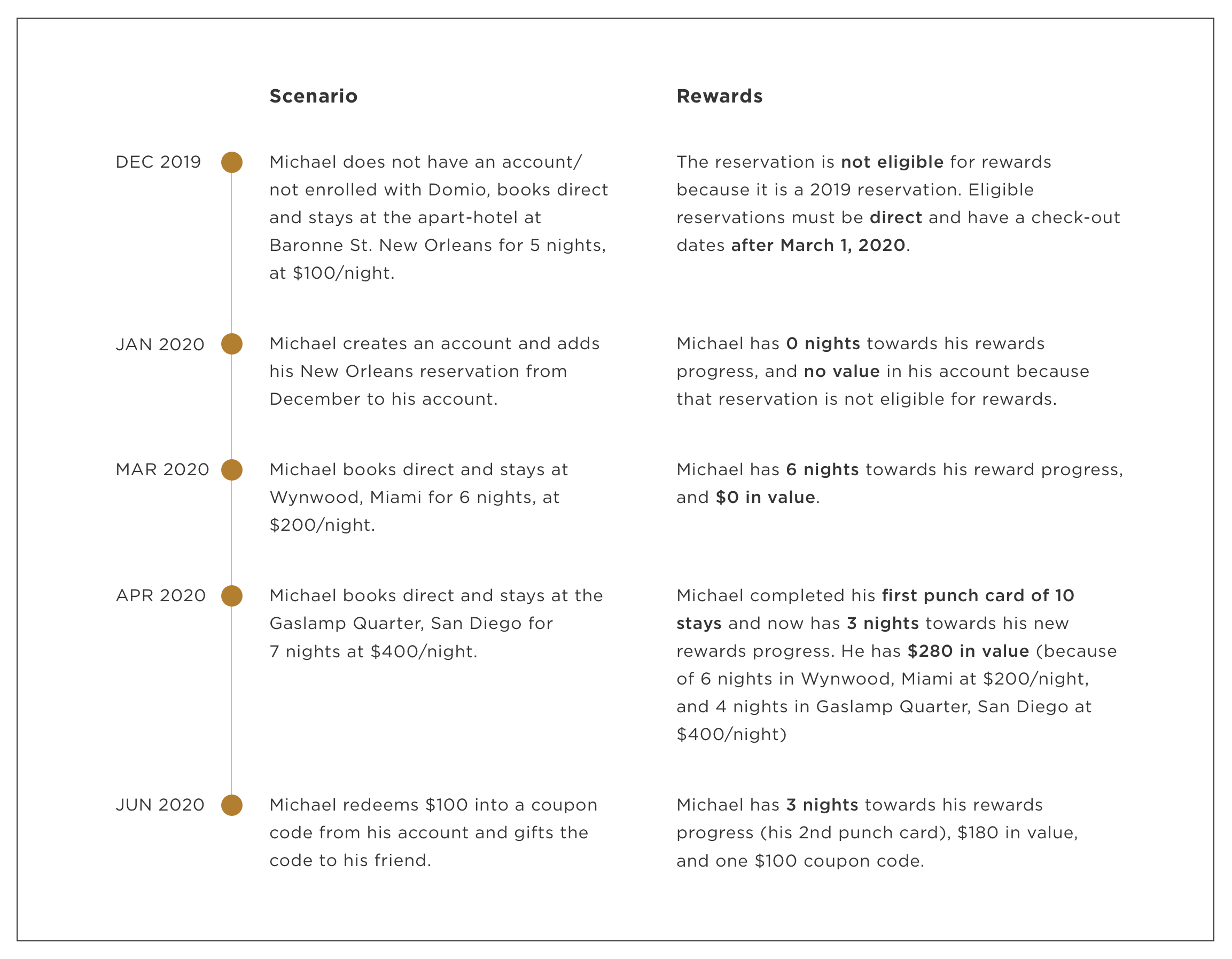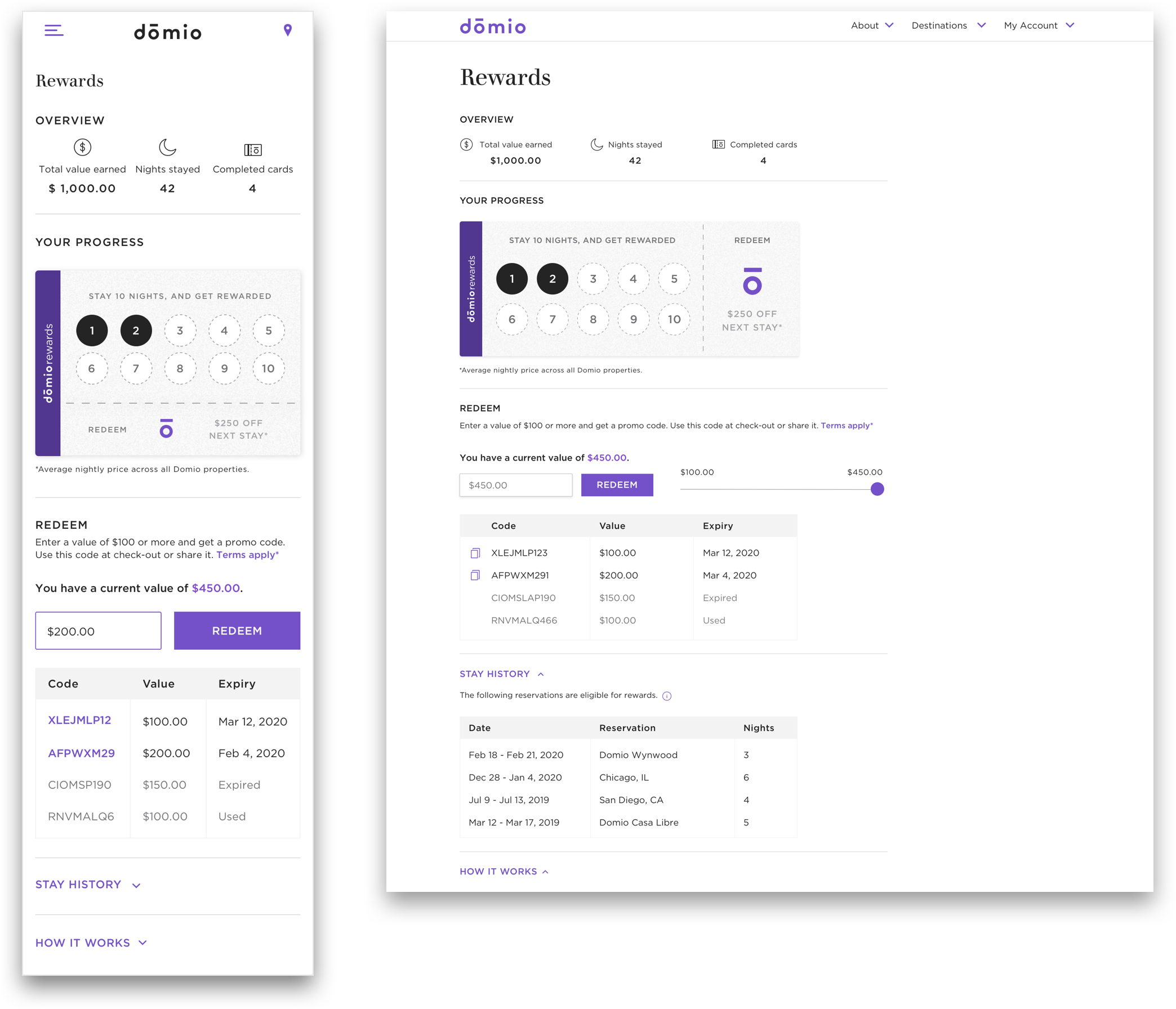 Guests can track their rewards through their personalized rewards dashboard (which can be found in their Accounts when logged in). Within the dashboard, they can redeem value into coupon codes, which can be used on a new reservation. Only direct bookings are eligible towards this program.