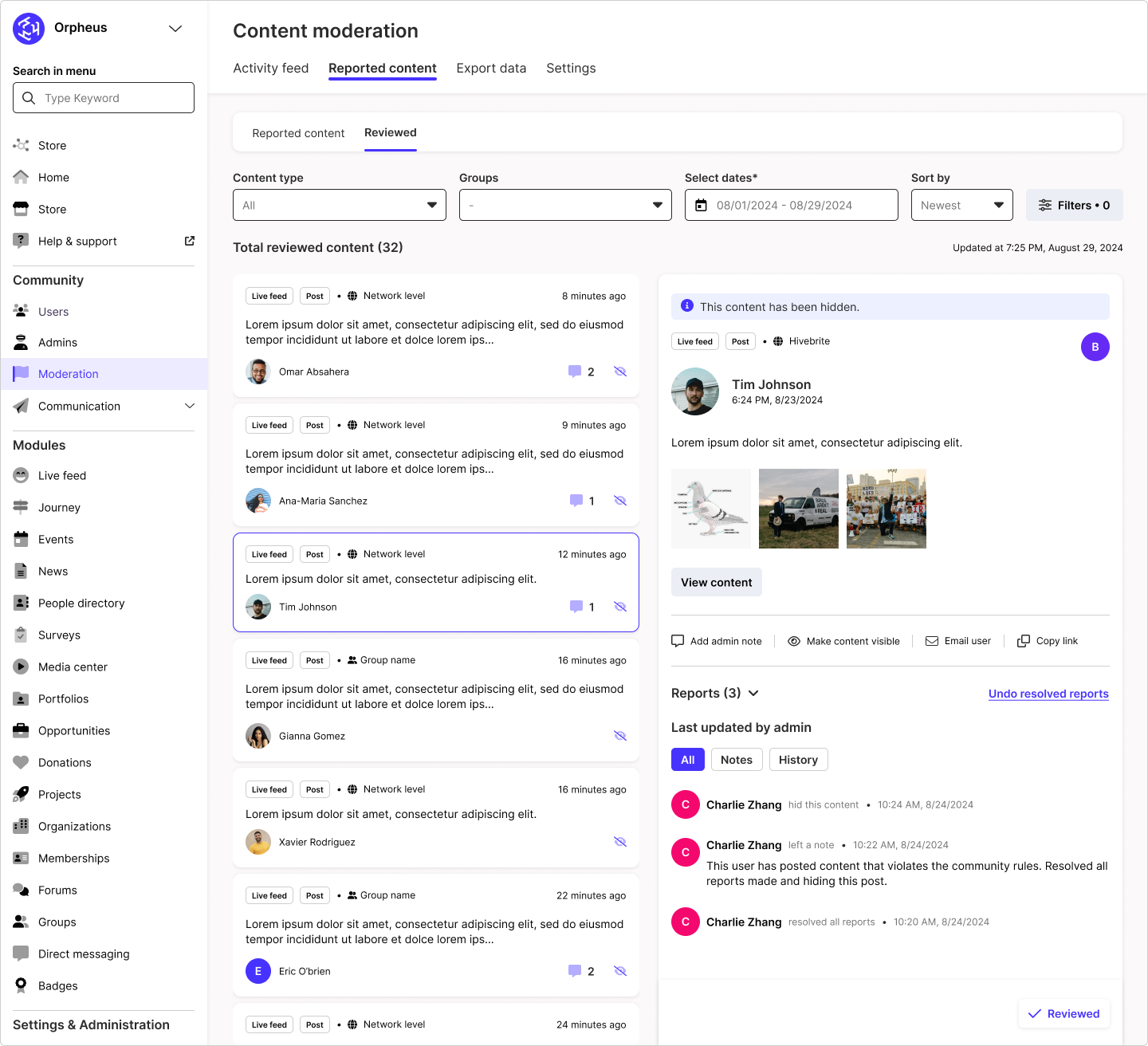 Just like the Activity feed tab, admins can view all reported content on the left panel and see more details on the right side. Admins will be able to see an organized detailed view of a reported content and how many reports have been made, all truncated in one view. They will get to see a list of reported comments and review each one before the content can be successfully marked as reviewed.