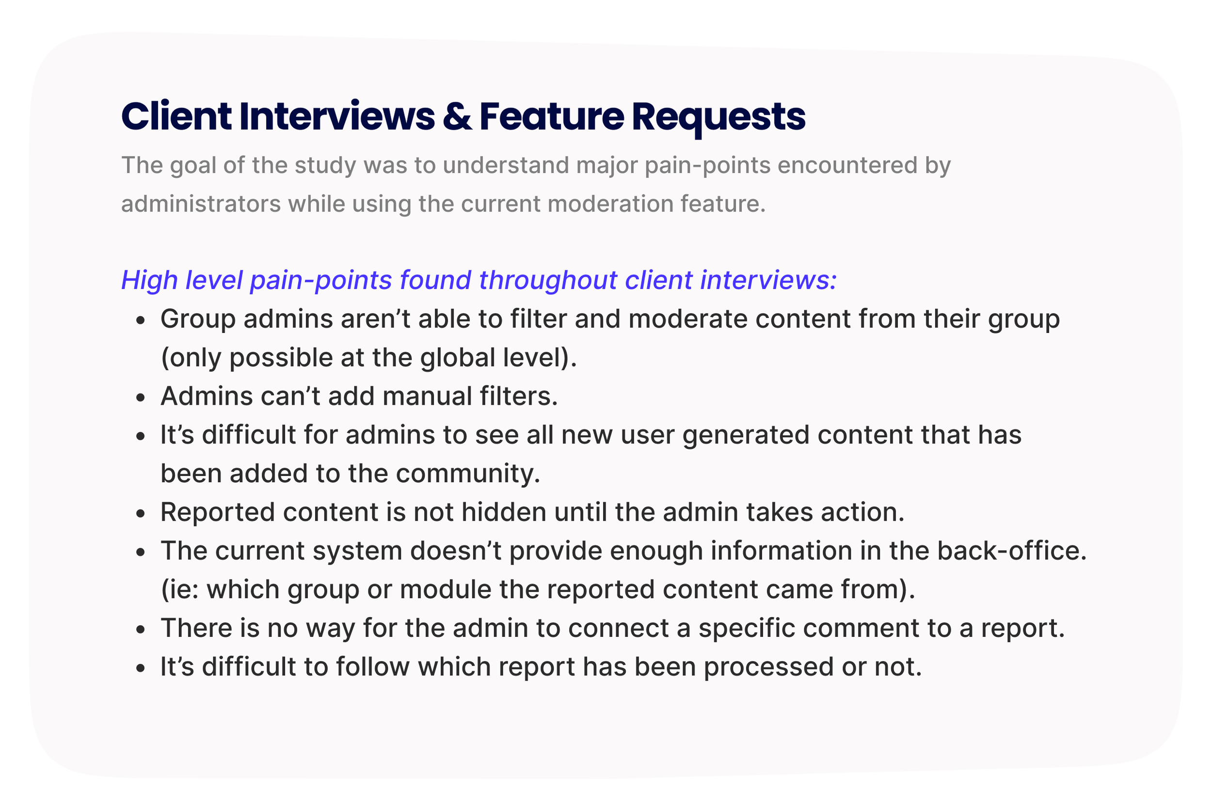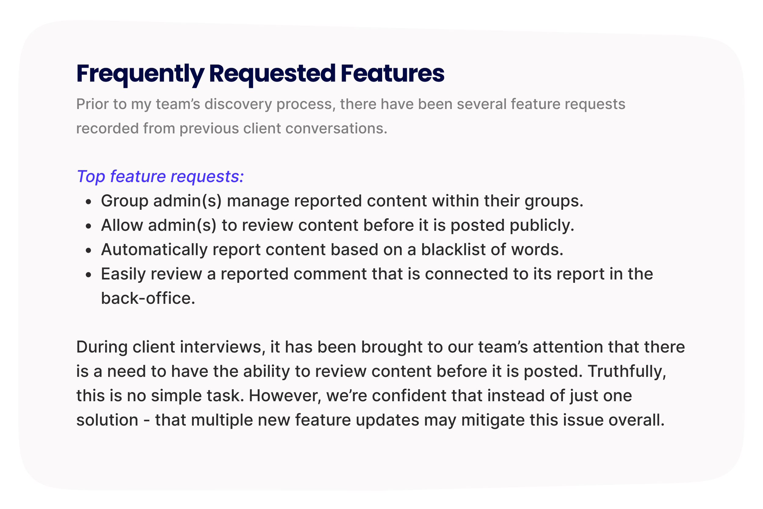 Before sketching any ideas, the Product Manager and I led a research initiative to speak with a diverse pool of clients for our discovery process to identify new opportunities.